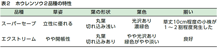 今回はレース1~19に対し抵抗性を持つ「スーパーセーブ(サカタのタネ)」、「エクストリーム(トキタ種苗)」の2品種について調査しました。10月上旬にユニフォーム粒剤を全面土壌混和した露地ほ場に、10月中旬に各品種を播種し、トンネル被覆をしました。10月下旬に雨よけビニルを展張して栽培し、12月上旬に収穫調査しました。どちらの品種もべと病は発生しませんでしたが、特性に違いが見られました(表1、2、図4)。作業性を重視したい場合は立性で軸の折れが少ない「スーパーセーブ」、収量を重視したい場合は大株で揃いが良い「エクストリーム」がオススメです。