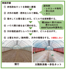 そこで、アザミウマの侵入防止効果が高い「赤色防虫ネット」と、土中の蛹を防除する「太陽熱土壌消毒」を組み合わせ、防除効果を検討しました(図2)。
