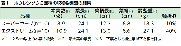 今回はレース1~19に対し抵抗性を持つ「スーパーセーブ(サカタのタネ)」、「エクストリーム(トキタ種苗)」の2品種について調査しました。10月上旬にユニフォーム粒剤を全面土壌混和した露地ほ場に、10月中旬に各品種を播種し、トンネル被覆をしました。10月下旬に雨よけビニルを展張して栽培し、12月上旬に収穫調査しました。どちらの品種もべと病は発生しませんでしたが、特性に違いが見られました(表1、2、図4)。作業性を重視したい場合は立性で軸の折れが少ない「スーパーセーブ」、収量を重視したい場合は大株で揃いが良い「エクストリーム」がオススメです。