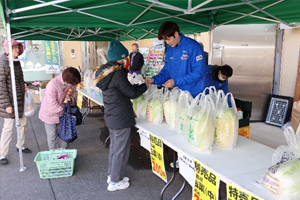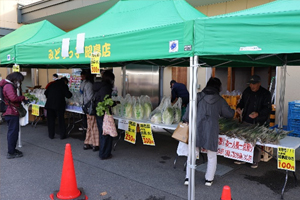 みどりっ子昭島店に立川ダイスがやってきました 12月22日(月)、みどりっ子昭島店にてプロバスケットボールチーム「立川ダイス」とのコラボイベントが行われました。収穫セールには、大﨑翔太選手が同店を訪れ、特設販売ブースで昭島産野菜を販売し、消費者や生産者と交流を図りながら地域の農業と昭島産農畜産物のPRを行いました。
